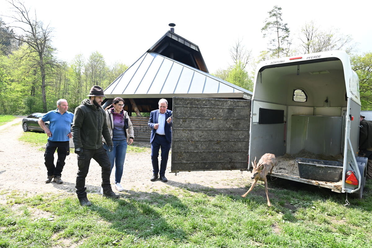 Doch dann hat er sich schließlich auf den Parkdecks noch eine kräftezehrende Verfolgungsjagd mit zehn Jägern und einigen Polizisten geliefert – und ist erneut entwischt. Am Dienstag wird der Bock in einem Pferdeanhänger von zwei Menschen vor die Grillhütte hinter dem Forsthof gefahren, die auch anderweitig schon ihr Herz für wilde Tiere entdeckt haben: Es sind mit Felix Wiedemann und Ramona Frey die Zieheltern der beiden Wildschweine Lotte und Tilda. Auf dem Hof der Wiedemanns durfte der Gefangene eine ruhige Nacht verbringen. Viele Menschen winken ihm hinterher.