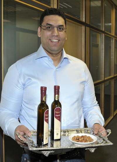 Mohamed Hassani mit dem Öl, das aus den Samen in den Kernen der Arganfrucht (im Teller) gepresst wird.