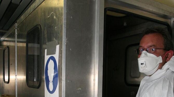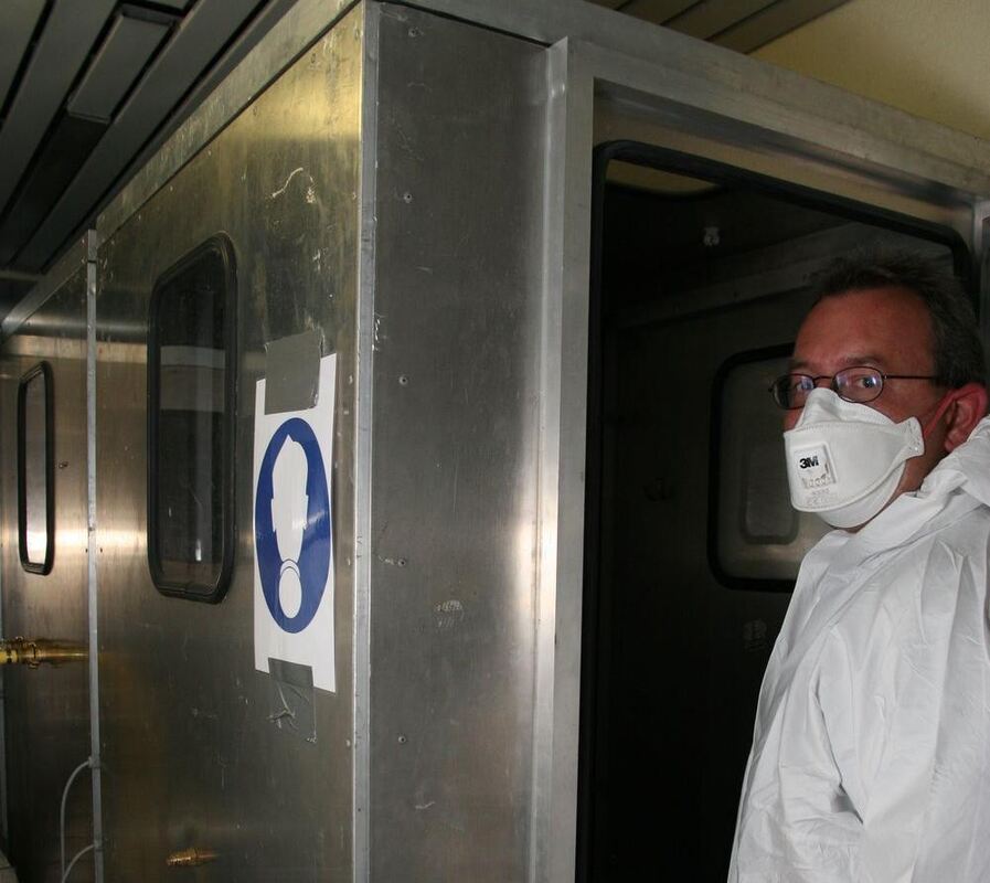 Ulrich Zwicker von der Dekra in Stuttgart vor der Asbest-Schleuse, durch die die alten Heizkessel entsorgt wurden. Nach Ausbau der Heizungsanlage wurden laut Dekra »bei der Raumluft keinerlei Asbestfasern festgestellt«.