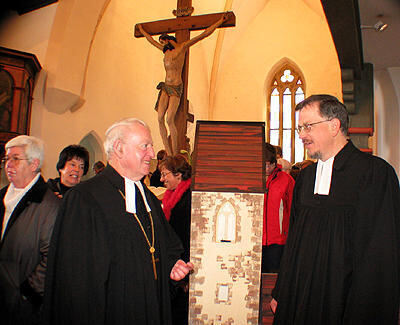 Kirche in der Kirche: Landesbischof Dr. Gerhard Maier (links) und Pfarrer Hans-Jörg Dinkel haben das mannshohe Modell der Clemenskirche in ihre Mitte genommen.