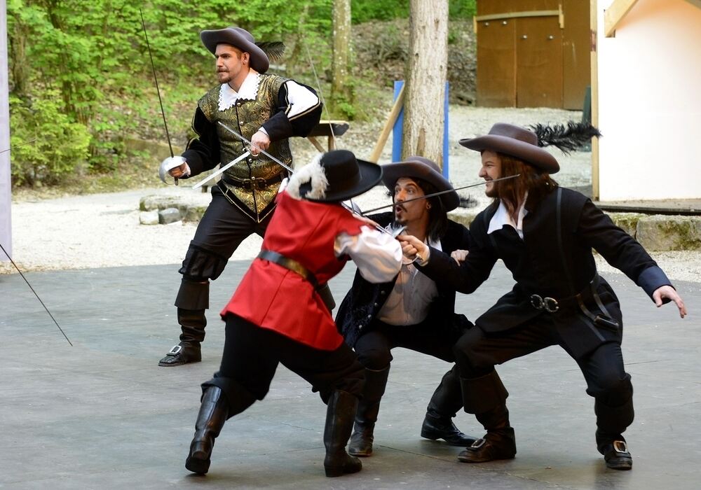 Die drei Musketiere (in Schwarz) in einer von Stefan Müller-Doriat choreografierten Fechtszene im Naturtheater Reutlingen.