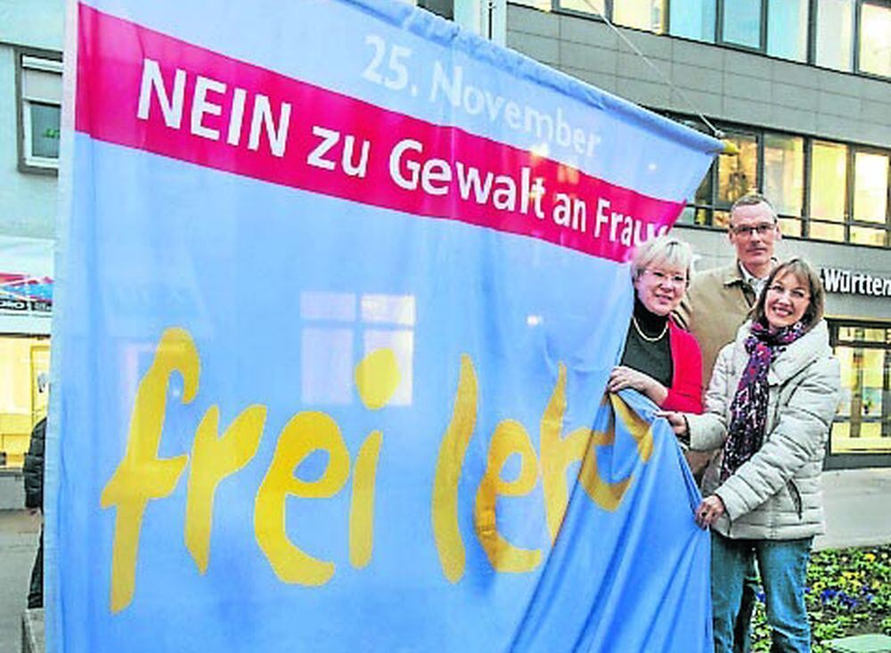Wurde gestern von Edeltraut Stiedl, Albert Keppler und Sandra Stopper gehisst: die Terre-des-Femmes-Fahne. FOTO: TRINKHAUS