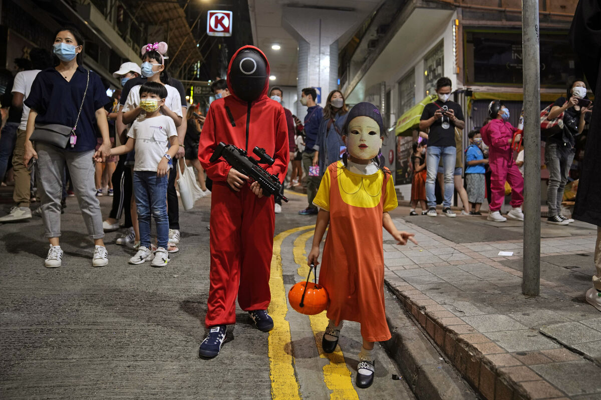 Kinder tragen Kostüme, die von der koreanischen Serie »Squid Game« inspiriert sind.