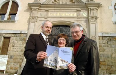 Die einprägsame Fassade des Landratsamtes mit Landrat Thomas Reumann, Kreisarchivarin Irmtraud Betz-Wischnath und Fotograf Manfred Herb.