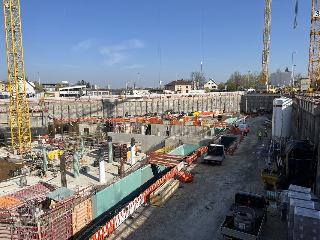 Aktuell ist die Baustelle mit 70 Mann besetzt, welche die Arbeiten voranbringen. Es stehen drei große Turmdrehkrane zur Verfügung, die Betonagearbeiten erfolgen mittels Betonpumpen und Rundverteilern. Zur Vervollständigung der Baustelleneinrichtung werden zeitnah zwei weitere Hochbaukräne aufgebaut, die Baustellenbesetzung wird auf etwa 100 Mann aufgestockt. Der Grundriss des Gebäudes ist für die weiteren Arbeiten in vier ungefähr gleich große Arbeitsabschnitte eingeteilt, welche stufenweise versetzt nach oben gebaut werden und das Gebäude langsam sichtbar machen.