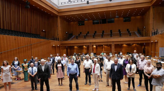 28 Mitglieder des neuen Integrationsrates wurden von OB Keck und Mitgliedern der Gemeinderatsfraktionen offiziel ins Amt eingeführt – in der Stadthalle, mit viel Abstand und ohne Handschlag. FOTO: LEISTER