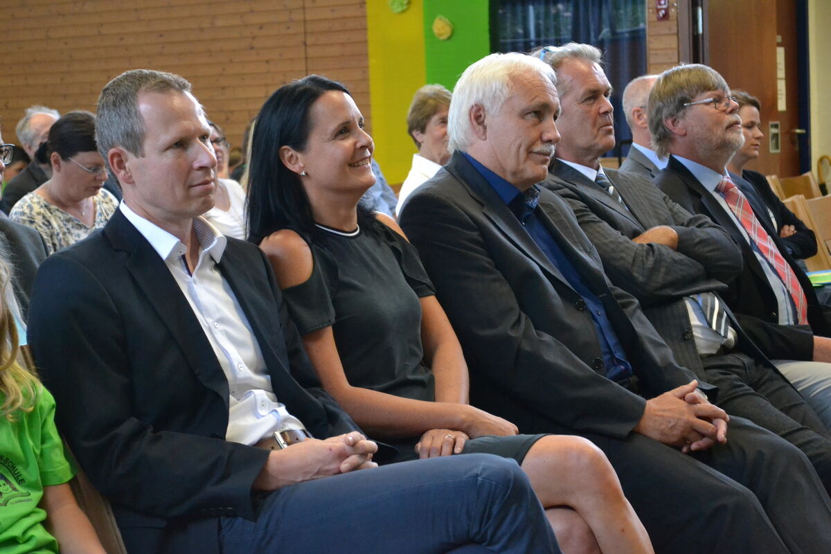 Verfolgten gespannt das bunte Programm, das die Schüler mit viel Begeisterung auf die Bühne brachten (von links): Jens Biehal, Schulleiterin Nicole Biehal, Schulamtsdirektor Wolfgang Straub, Leitender Schulamtsdirektor Roland Hocker und Joachim Kalk, Rektor der eng verbundenen Peter-Rosegger-Schule.
