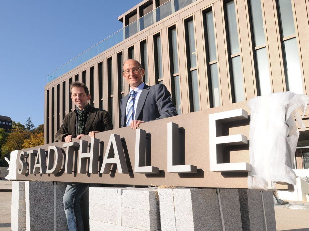 Der Endspurt läuft: Klaus Kessler, der Leiter der Stadthallen-Projektgruppe (rechts), und sein Stellvertreter Til Eder sind guter Dinge, dass die »Halle für alle« fristgerecht in Betrieb gehen kann. Auch das Namensschild wird demnächst montiert.
