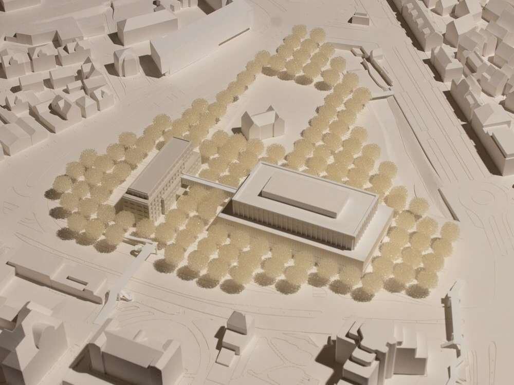 Der Entwurf des Berliner Büros Max Dudler, des Stadthallenarchitekten, greift für das Hotel die prinzipielle Gliederung der Stadthalle in einem kompakten Baukörper auf, der mit seiner Backsteinfassade auch auf das daneben liegende Krankenhäusle verweist. MODELLFOTO: MOZERE