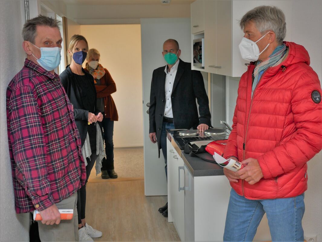 Wolfram Herrmann (von links), Heike Hein, Karin Ast, Ulrich Högel und Jürgen Ast haben sich am Donnerstag das sanierte GWG-Haus der sechsten Oase angesehen, in dem nun sechs Bewohner eine neue Bleibe finden. FOTO: LEISTER