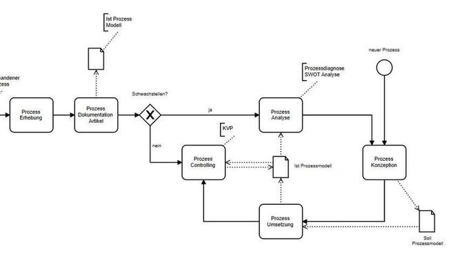 Nach einer Projektplanung vollzieht sich die Datenintegration, die möglich ist, ohne den Ablauf im Unter[1]nehmen zu stören. Vor Ort bildet das Team die Mitarbeiter am intuitiv bedienbaren System weiter. Neben einer sinnvollen Datenmanagementlogik und Suchmaschine steht die nachhaltige Aktualisierung der (nach BPMN) modellierten Prozesse im Vordergrund.