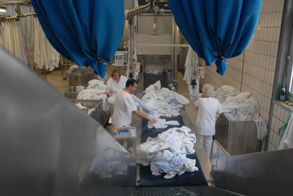 Frisch gereinigt landen die Textilien auf dem Sortierband der Zentralwäscherei.