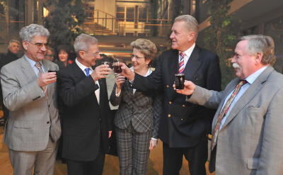 Auf ein gutes Neues (von links): Beim FDP-Empfang im Domino-Haus prosteten sich Professor Dr. Willi Weiblen, Dr. Knut Hochleitner, Oberbürgermeisterin Barbara Bosch, Wirtschaftsminister Ernst Pfister und Hagen Kluck frohgemut zu.