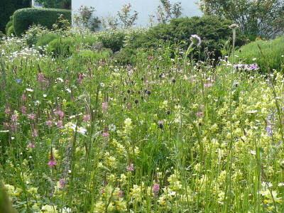 In der Blumenwiese bieten Margeriten, Klappertopf, Esparsetten und Flockenblumen heimischen Insekten Nahrung.