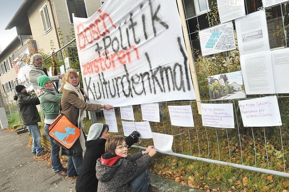Mit Protest am Bauzaun und anderen Aktionen wehren sich die Gmindersdörfler gegen den Abriss der Erdle-Bauten.