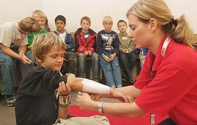 Mit Ernst und Konzentration bei der Sache waren die kleinen »Ersthelfer«, hier mit Corinna Tappert beim Verbinden.