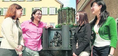 Erste Anlaufadresse von Rachel Lohrmann, Albert Landman, Barbara Könye und Sun Jian Nan (von links) war der Zunftbrunnen. Von dem Kunstwerk sind die vier restlos begeistert.