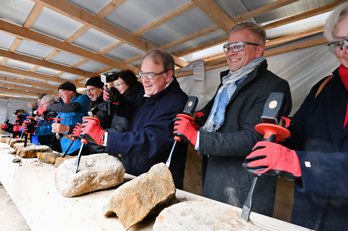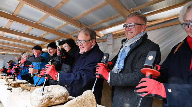 Klopfen symbolisch einen Stein und freuen sich über den Baubeginn des »gläsernen Hauses« in der Oberamteistraße: Gemeinderäte verschiedener Fraktionen, die beteiligten Architekten sowie Oberbürgermeister Thomas Keck (Dritter von rechts), Sozialbürgermeister Robert Hahn, Baubürgermeisterin Angela Weiskopf und Finanzbürgermeister Roland Wintzen.