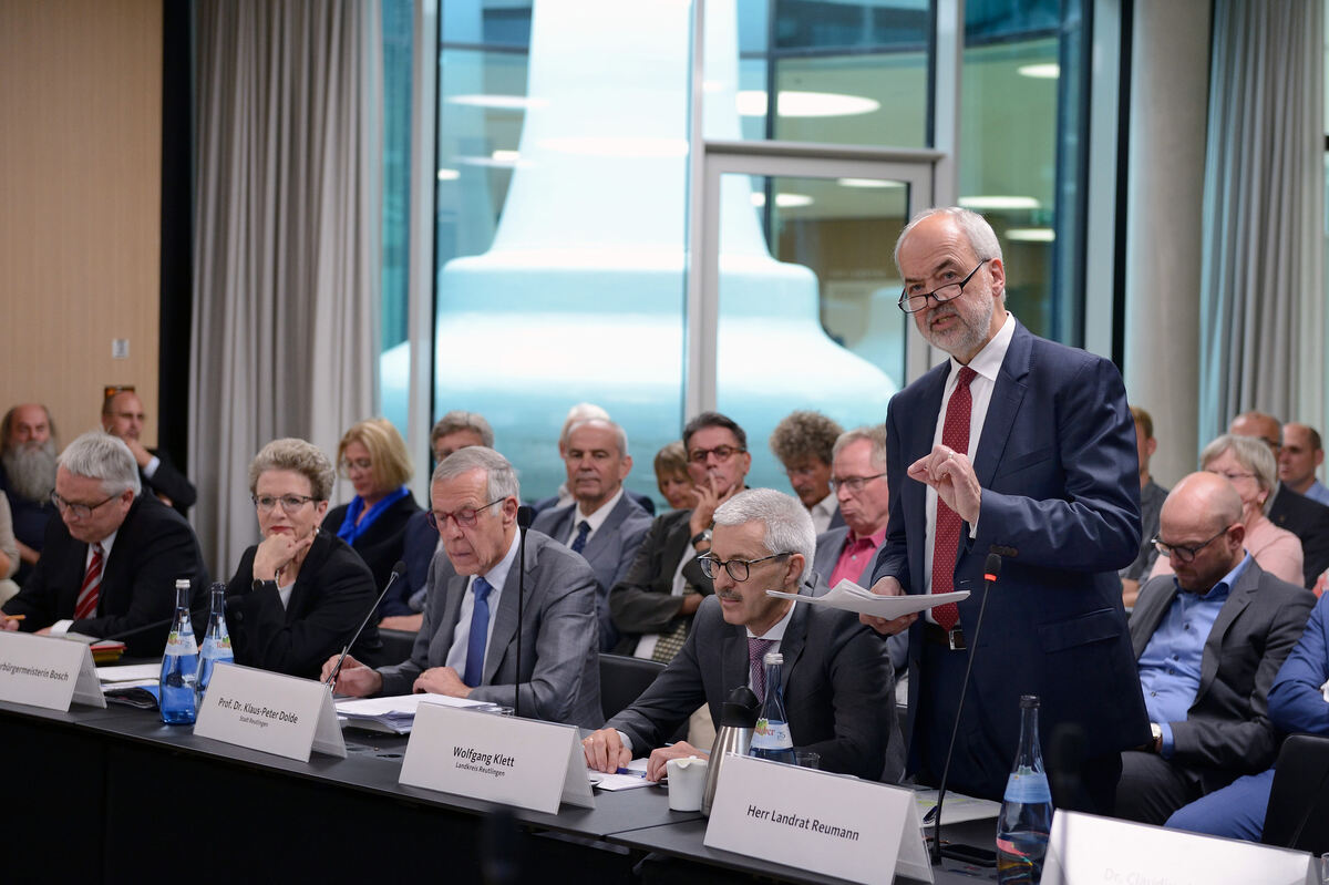Wie schon bei einer Auskreisungsanhörung in Stuttgart 2018 (Bild) beschwört Landrat Thomas Reumann (stehend) auch in seinem »offenen Brief« an Thomas Keck das »partnerschaftliche Miteinander«. Der OB versteht etwas anderes darunter. ARCHIV-FOTO: PIETH