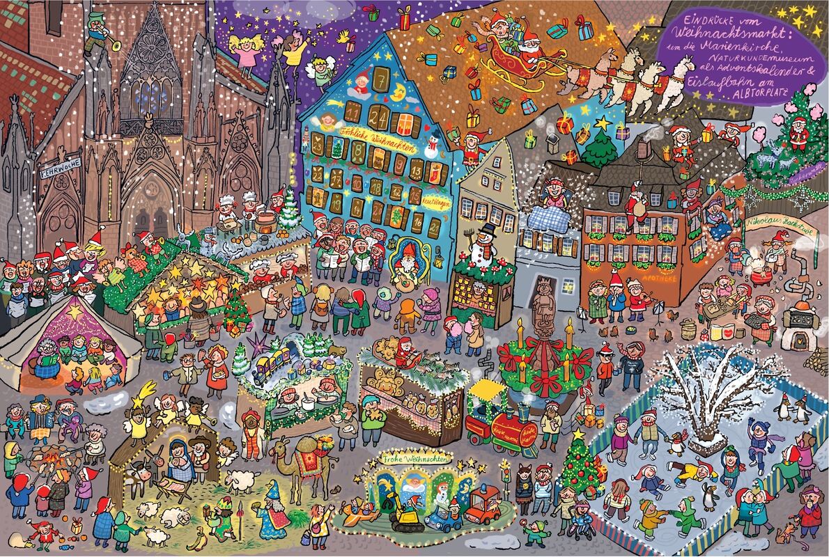 REUTLINGEN. Lust auf Aufheiterung? Illustratorin Steph Burlefinger zeigt in ihrem Bilderbuch »Reutlingen wimmelt« (Silberburg Verlag, Tübingen) mit viel Liebe zum Detail eine gerade in diesen Tagen von vielen so schmerzlich vermisste kunterbunte Stadt, die von vielen Lebe- und Fantasiewesen bevölkert wird. Acht großformatige Doppelseiten bieten Entdeckerspaß für Groß und Klein. Auf Burlefingers Marktplatz darf man im Maximilianbrunnen baden. Der Bürgerpark ist deutlich grüner als in natura und von fröhlichen Bürgern dicht bevölkert. Am Echazufer gibt es einen Nacktbadestrand, Spiderman hilft beim Putzen der tausend Stadthallenscheiben. Im Freibad tummelt sich ein fröhliches Loch-Ness-Ungeheuer im Kinderplanschbecken, aus dem Achalmturm kreucht ein Drachenmädchen. Auf der letzten Doppelseite findet völlig abstandsfrei der Reutlinger Weihnachtsmarkt statt. (igl)