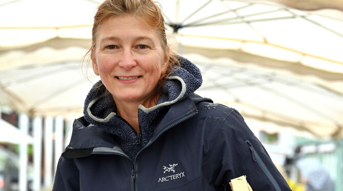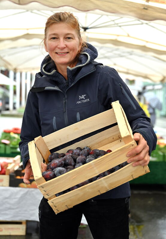 Oliva Mikeler präsentiert auf dem Reutlinger Wochenmarkt Zwetschgen.