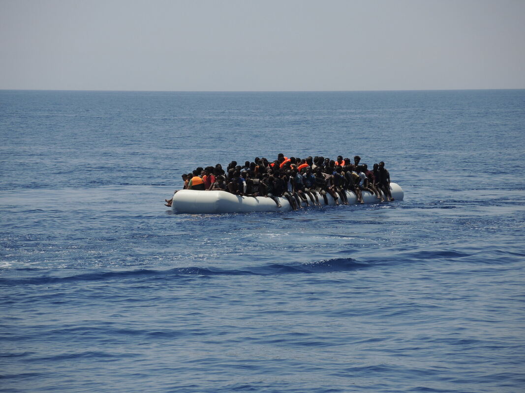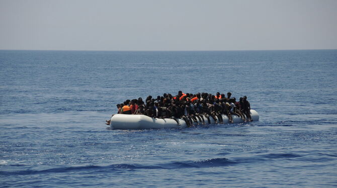 Ein Archivbild: Geflüchtete sitzen auf einem überladenen Schlauchboot im Mittelmeer. FOTO: KLIMKEIT/DPA