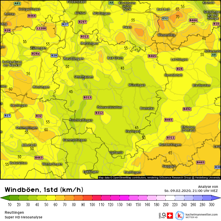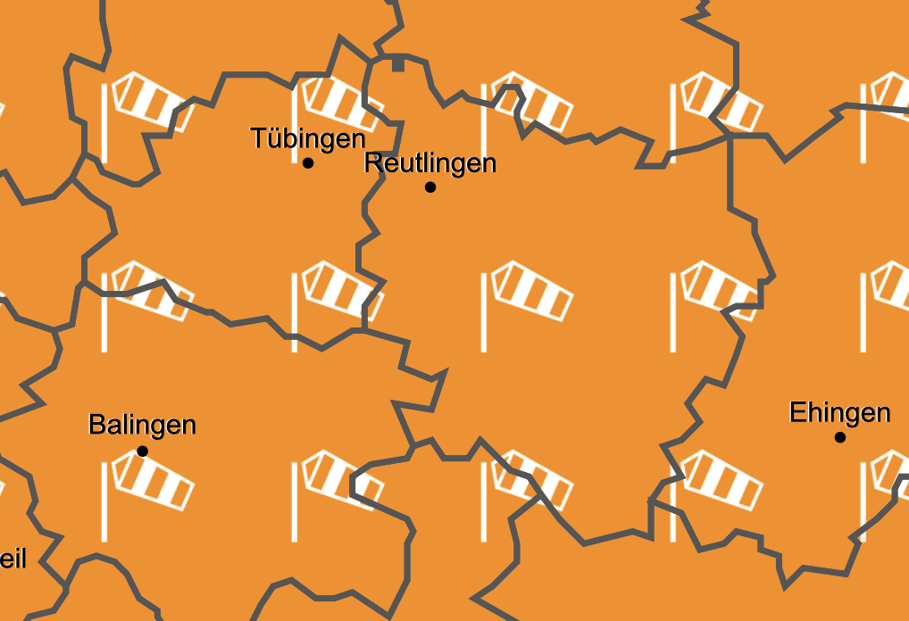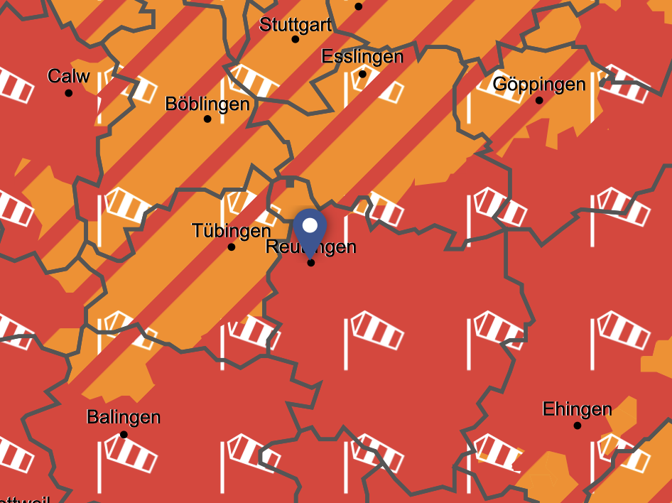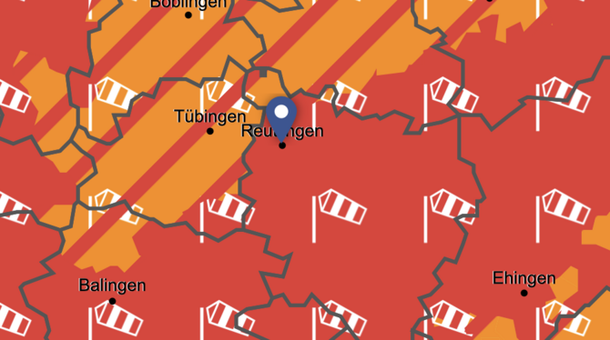 Wie beim Hagelsturm 2013 soll es den Landkreis Reutlingen auch jetzt stärker erwischen als den Landkreis Tübingen. Der Deutsche Wetterdienst warnt für den Kreis Reutlingen im Zeitraum zwischen Sonntag, 22 Uhr und Montag, 18 Uhr vor Orkanböen. Oberhalb 600 Metern Höhe sollen Orkanböen mit Geschwindigkeiten zwischen 105 km/h (29m/s, 56kn, Bft 11) und 120 km/h (33m/s, 64kn, Bft 12) auftreten, die anfangs aus südwestlicher, später aus westlicher Richtung kommen.