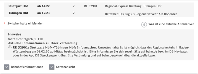 Die Deutsche Bahn weißt Reisende, die zwischen Tübingen und Stuttgart unterwegs sind, darauf hin, dass ein Unwetter naht. Der Regionalverkehr in Baden-Württemberg könne ab Mittag beeinträchtigt sein. Der Fernverkehr zur Nordseeküste wurde bereits eingestellt. Wegen des Orkans empfiehlt die Bahn Passagieren, ihre für Sonntag, Montag und Dienstag geplanten Fernreisen zu verschieben. Alle bereits gekauften Tickets für diese Tage sind laut Bahn bis 18. Februar gültig oder können kostenfrei storniert werden.