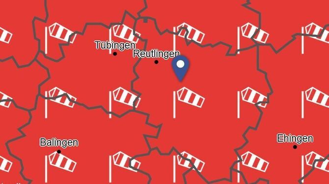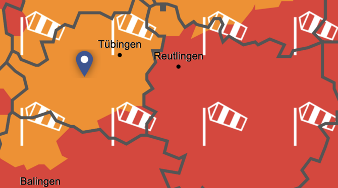 Von heute 20 Uhr bis Dienstag 18 Uhr rechnet der Wetterdienst für den Kreis Tübingen mit Sturmböen. Sie sollen Geschwindigkeiten zwischen 65 km/h (18m/s, 35kn, Bft 8) und 85 km/h (24m/s, 47kn, Bft 9) erreichen und anfangs aus südwestlicher, später aus westlicher Richtung kommen. In exponierten Lagen müsse zudem mit schweren Sturmböen bis 100 km/h (28m/s, 55kn, Bft 10) gerechnet werden.