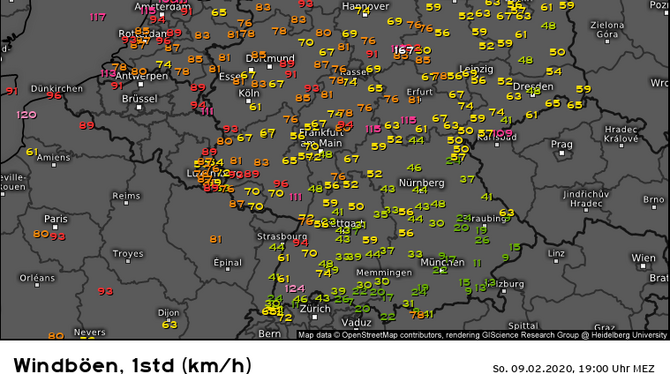 Die Sturmlage mit Böen mit Geschwindigkeiten zwischen 65 km/h (18m/s, 35kn, Bft 8) und 85 km/h werde aber bis Mittwoch anhalten, so Puckert . Der stärkste Windstoß in der Nähe Reutlingens wurde mit 109 Stundenkilometern - Windstärke 11 - bei Stuttgart gemessen. In den vergangenen zehn Minuten (Stand 10.53 Uhr) wurden am Albrand noch Geschwindigkeiten von 87 Stundenkilometern registriert. Aus dem Stadtgebiet liegen gerade keine Daten vor, hier weht wenn überhaupt ein laues Lüftchen.