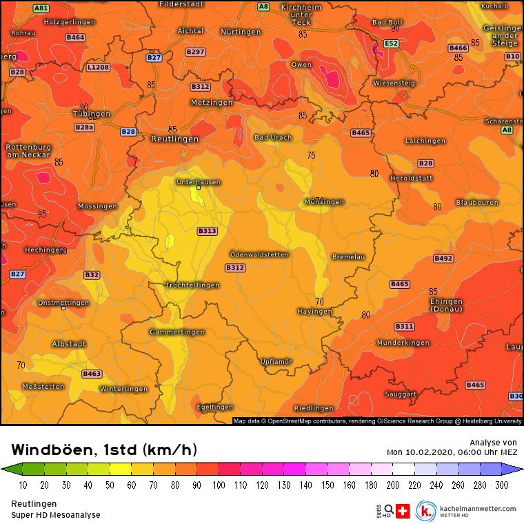 Wie prognostiziert läuft Sturm »Sabine« am Montagmorgen in der Region zur Höchstform auf. Während der Landkreis Tübingen auf der Wetterkarte komplett orange, rot und pink ist, was Windböen mit Geschwindigkeiten von bis zu 110 Stundenkilometern bedeuten, ist der Landkreis Reutlingen bei Münsingen und Unterhausen noch gelb. Dort kommt es laut kachelmannwetter.de zu Windgeschwindigkeiten von bis zu 50 Stundenkilometern, an den Uracher Wasserfällen und auf der Achalm weht der Wind mit 90 bis 100 Stundenkilometern.