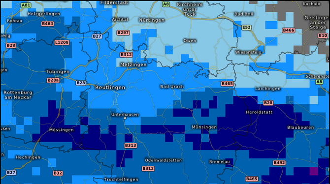 Der Regen in der Region wird stärker. Am heftigsten ist der Niederschlag zwischen Münsingen und Blaubeuren und in Mössingen. Eine Überflutungsgefahr besteht laut Wetterdienst aktuell nicht.