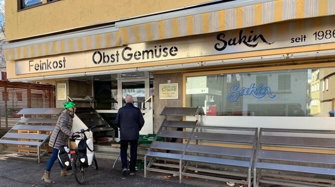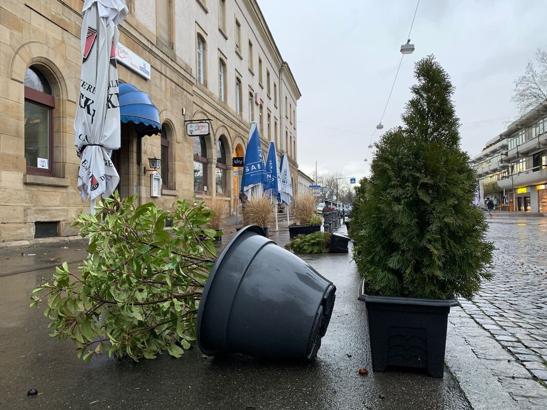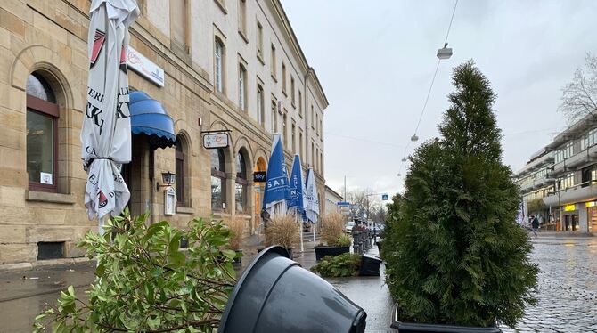 Der Deutsche Wetterdienst hält die Warnung vor Orkanböen für den Landkreis Reutlingen bis 15 Uhr immer noch aufrecht, in der Reutlinger Innenstadt ist aber längst Normalität eingekehrt. Abgesehen von Laub, das durch die Gassen weht, ist von Sturm fast nichts zu spüren. Die größte Folge des Unwetters ist in der Innenstadt wohl der Umstand, dass der Gemüsehändler in der oberen Wilhelmstraße geschlossen hat. Dort, wo sonst Obst und Gemüse liegen, ist heute nur kalter Stahl zu sehen. Immer wieder machen Passanten vor der Türe halt und lesen das dort angebrachte Schild mit dem Hinweis, dass der Laden morgen wieder geöffnet haben wird.