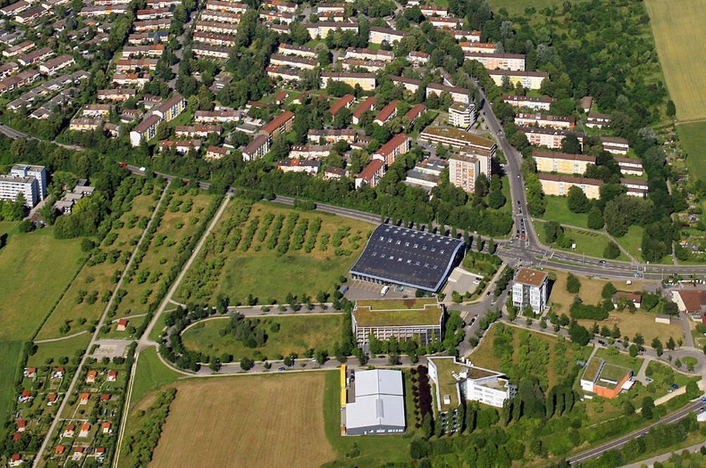 Zu Unterbringung von Flüchtlingen vorgesehen: der Orschel-Park (untere Bildhälfte) unweit von Orschel-Hagen (oben). LUFTBILD: GROHE