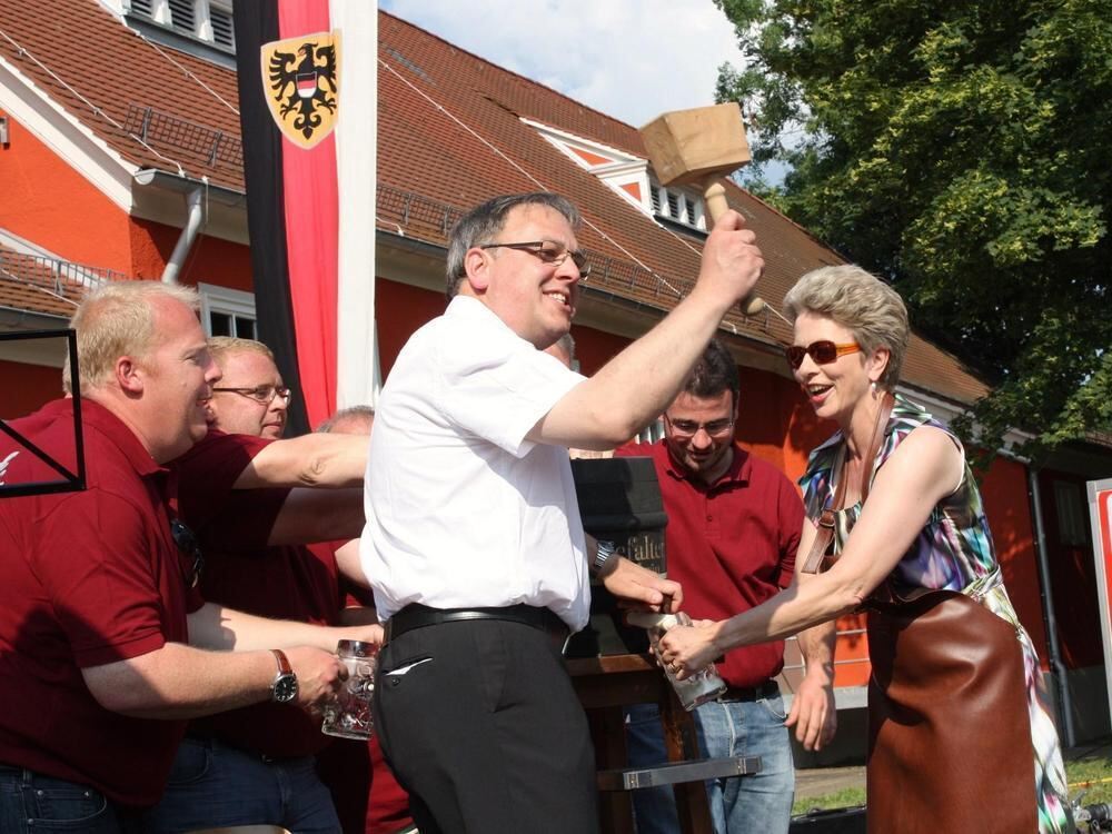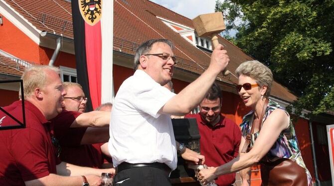 Betzingens Bezirksbürgermeister Thomas Keck – auf dem Foto bei der Eröffnung des Dorffestes mit OB Barbara Bosch – hat allen Grund, ein Fass aufzumachen: Er hat ein hervorragendes Ergebnis eingefahren, und auch seine Partei, die SPD, hat alle anderen Gruppierungen weit hinter sich gelassen. GEA-ARCHIVFOTO