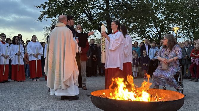 REUTLINGEN. In düsteren Zeiten strahlt das Licht des Glaubens besonders hell. Mit dem Osterfest erreicht das Kirchenjahr seinen entscheidenden Höhepunkt. Christen erinnerten auch in Reutlingen an das Leiden von Gottes Sohn Jesu, seinen Tod und seine Auferstehung. Besonders eindrucksvoll unter freiem Himmel am Samstag bei der Osternacht auf der Pomologie.