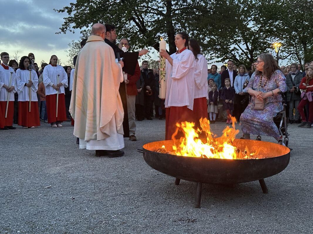 Es ist ein buntes Völkchen aus Alten und Jungen, Familien mit Kindern, das eine wahrhaft frohe Botschaft hört: Gott hat den gekreuzigten Jesus von Nazareth auferweckt. Er ist bleibender Sieger über Unheil, Finsternis und Tod. Und dieser Sieg betrifft das Leben aller, die davon erfahren. Wie schön daran zu glauben, während in der Ukraine oder anderswo auf der Welt Krieg herrscht, dubiose Gestalten Lügen und Gewalt verbreiten. Der katholische Pfarrer Matthias Dangel und sein evangelischer Kollege Thorsten Eißler zünden in großer Verbundenheit Osterkerzen an. »Mit seinem Licht erleuchte euch der Auferstandene«, rufen sie den Menschen zu. Es sind Momente des Innehaltens und der Nachdenklichkeit, die alle bewegen.