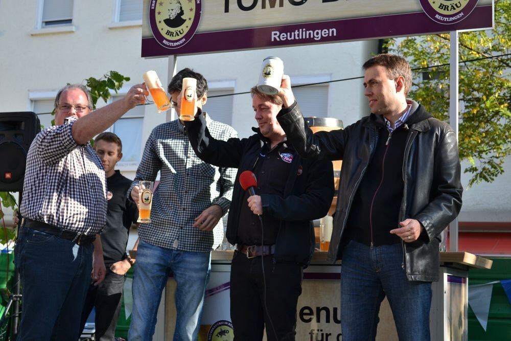 Der Fassanstich ist geglückt (von links): Claus Hamann vom Metzgerstraßenverein, Jonny Stojanovic von Tomo Bräu, Moderator Markus Bernard und Ehrengast Nils Schmid. FOTO: RABE