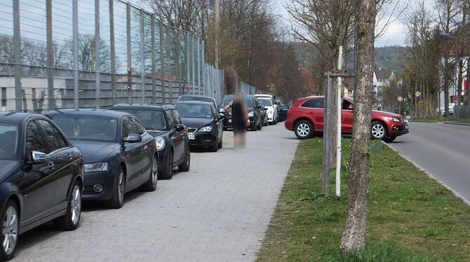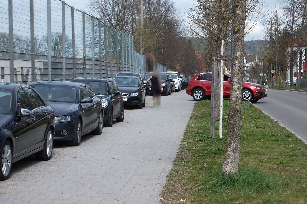 Der vor wenigen Jahren sanierte kombinierte Geh- und Radweg entlang des TSG-Geländes gehört bei Fußballspielen weitgehend den Autofahrern. Manche nehmen nicht die »Ausfahrt« über den Bürgersteig, sondern bevorzugen den Off-road-Ausstieg direkt durch die Rabatten. GEA-FOTO: GLITZ