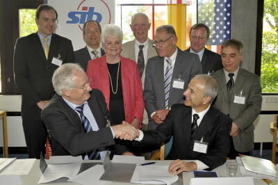 Unterzeichnung des Kooperationsvertrags: im Vordergrund die Präsidenten James L. Doti (rechts) und Peter Nieß. Dahinter (von links) Professor Gerd Nufer, ESB-Dekan Ottmar Schneck, das Ehepaar Schmid, Auslandsbeauftragter Gerard Gilbertson, Professor James J. Coyle (Chapman University) und Professor Robert LoBue.