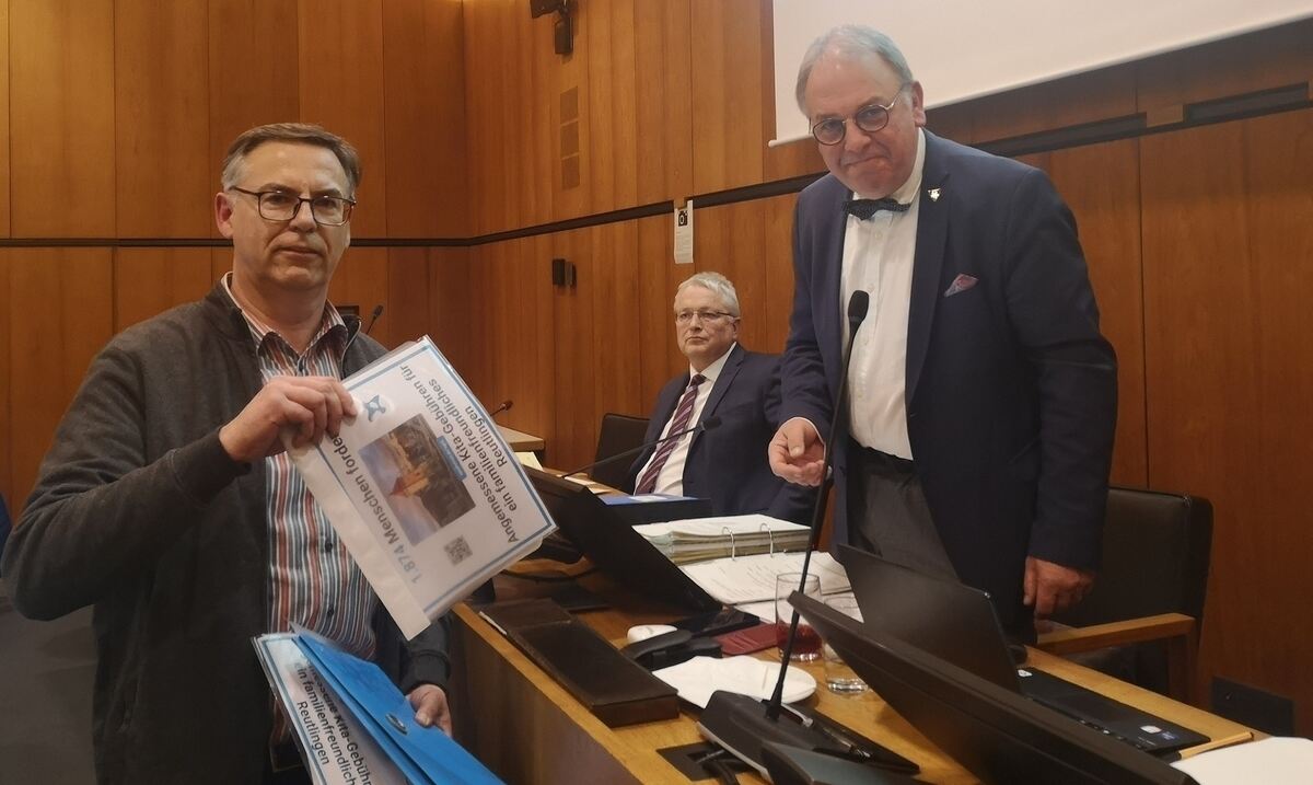 Rainer Riedinger überreicht OB Thomas Keck die Petition für angemessene Kita-Gebühren, die von mehr als 1.800 Personen unterzeichnet worden ist. Im Hintergrund Bürgermeister Robert Hahn.