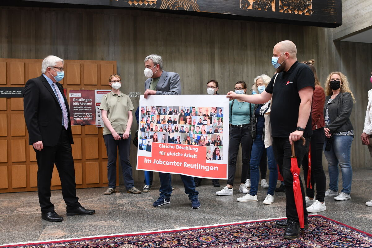 Reutlingens Verwaltungsbürgermeister Robert Hahn (links) nimmt die Petition für gleiche Bezahlung im Jobcenter entgegen. FOTO: ZENKE