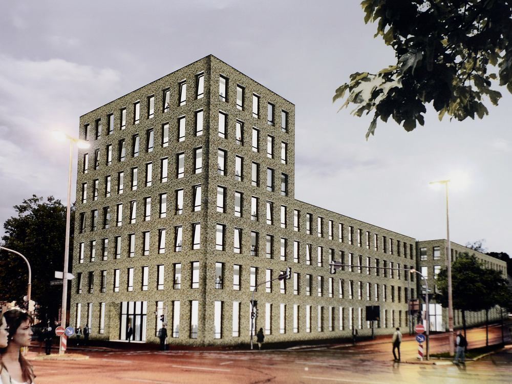 Der erstplatzierte Entwurf des Reutlinger Büros Riehle+Assoziierte: Strenge Ziegelfassade mit nahezu einheitlichem Fensterformat und Eingang am Oskar-Kalbfell-Platz. GRAFIK: RIEHLE