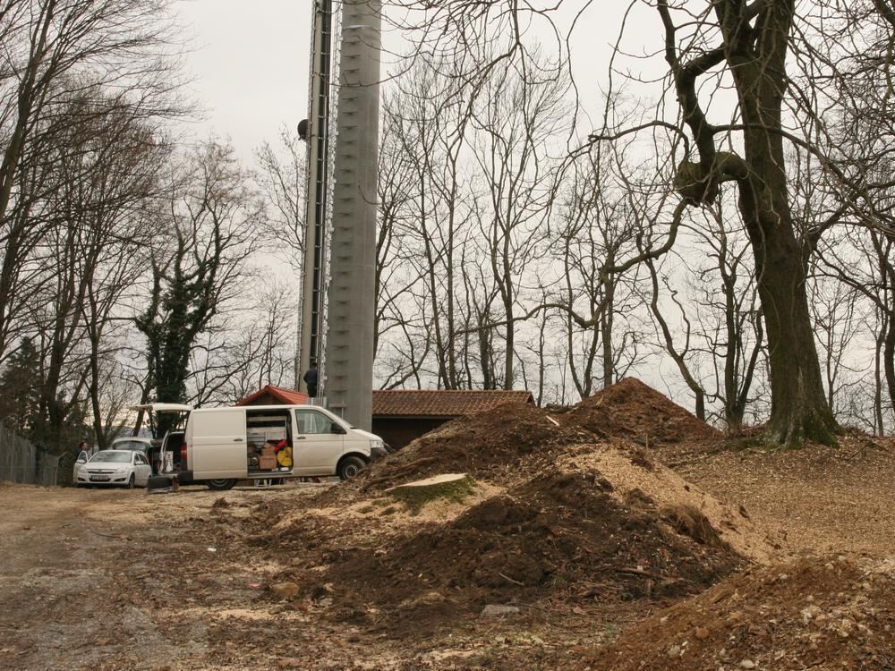 Der neue Mast (im Vordergrund) steht, die Bäume sind längst gefällt. Der alte Mast im Hintergrund wird abgebaut.