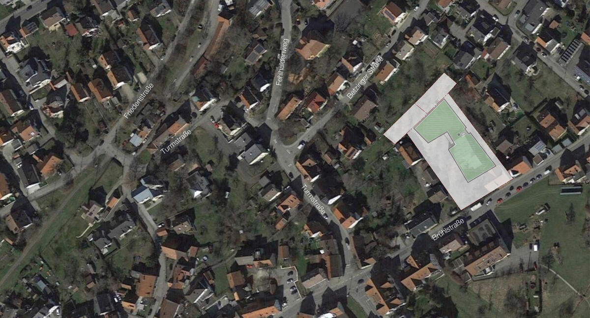 So könnte es einmal ausshen: Die markierte Fläche stellt das neue Pflegeheim an der Brühlstraße mit seinem großen Außenbereich dar.
