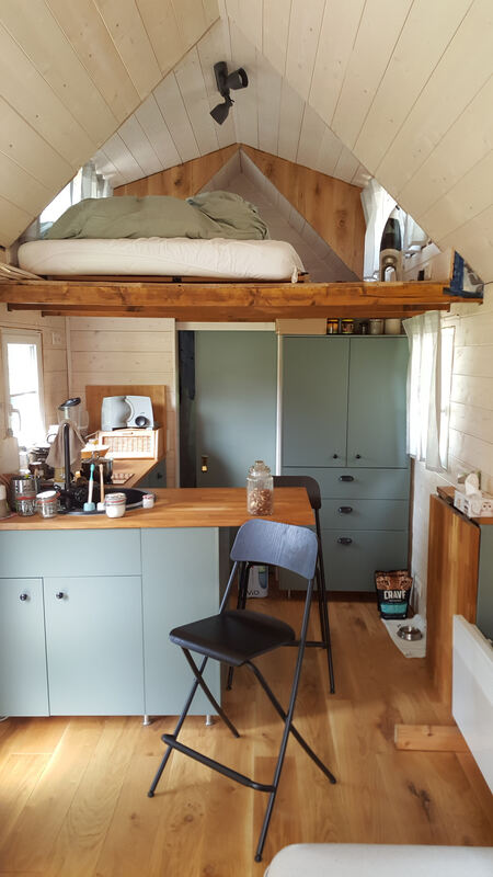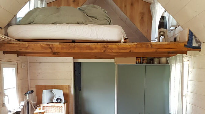 Drinnen: Klein und kuschlig. Die Tür hinten führt zum Bad. Oben die Empore mit Bett.