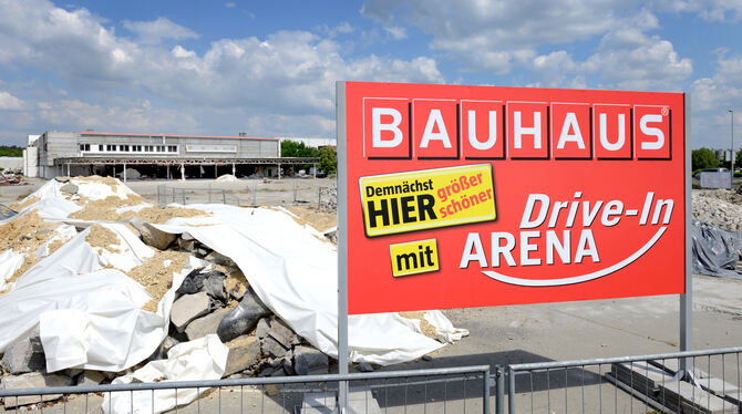 Das Bauhaus zieht um, weil es an seinem jetzigen Standort an der Emil-Adolff-Straße zu eng geworden ist. Insbesondere die Parkfläche reicht nicht mehr aus. Auf dem 18 000 Quadratmeter großen Areal im Industriegebiet ist nicht nur Platz für eine neue Verkaufshalle samt »Stadtgarten«, sondern auch wie in anderen Filialen für eine Drive-In-Arena: Bestellte sperrige Ware wird abholfertig bereitgestellt, die Kunden können mit ihren Wagen in die Halle einfahren, das Gewünschte aufladen und beim Herausfahren an der Kasse bezahlen. (GEA)
