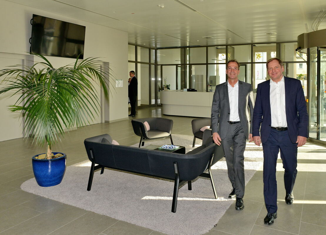 Freuen sich auf die Arbeit im neuen Haus: IHK-Hauptgeschäftsführer Dr. Wolfgang Epp (rechts) und Detlef Werneck, Bereichsleiter Zentrale Dienste, der viel mit der Abwicklung des Neubaus zu tun hatte. FOTO: NIETHAMMER