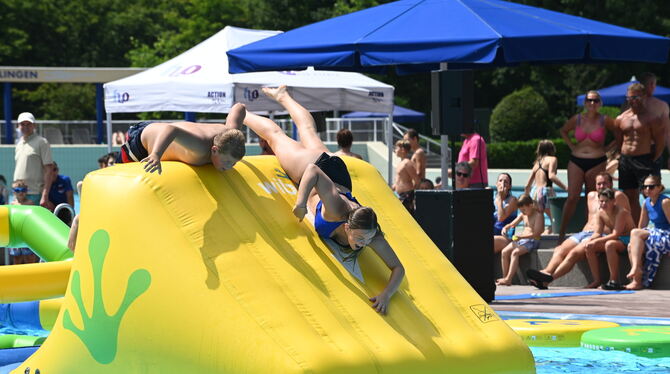 Jungs gegen Mädels bei den Wasserspielen im Schwimmerbecken, die sich großer Beliebtheit erfreuen.