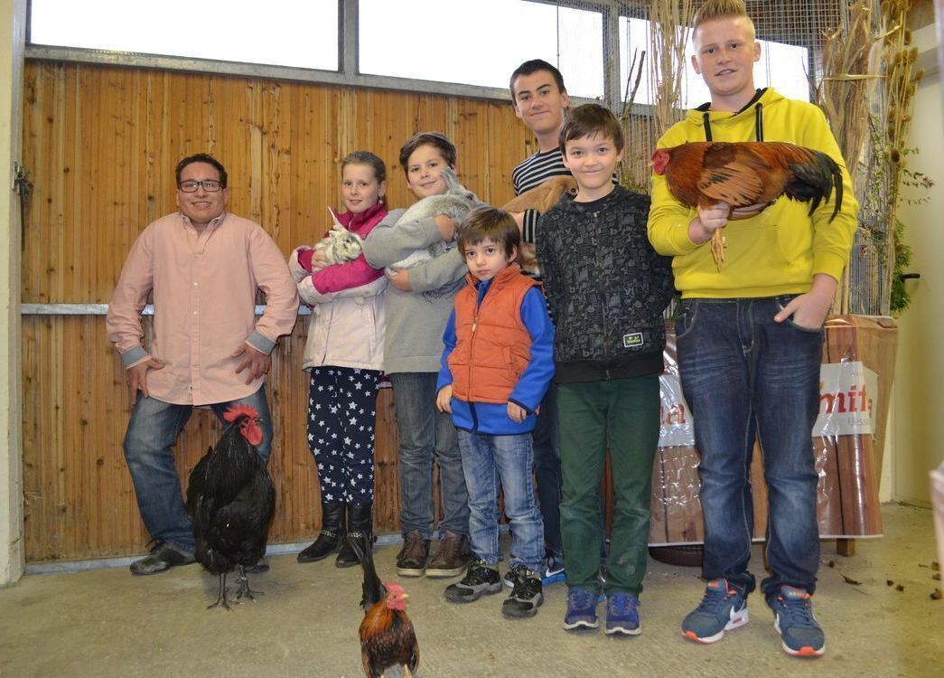 Der aktive Züchter und Kreismeister Steffen Veit (links) und sein schwarzer Australorps mit den Nachwuchs-Züchtern Nadja, Benjamin, Alex, Sven, Lucas und René. FOTO: ANTZ